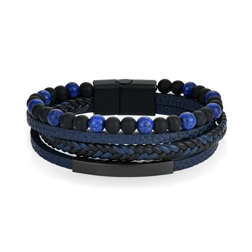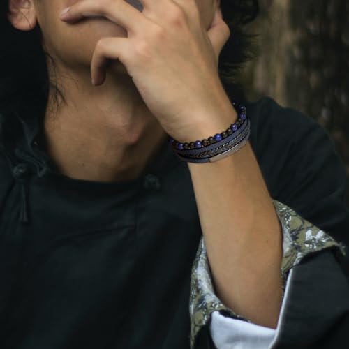 Raymard - سوار رجالي من رايمارد بتصميم عين النمر من الزجاج البركاني الاسود وحجر اللازورد وحجر اللازورد، سوار مضفر ملتف من الجلد للرجال، مشبك من الستانلس ستيل - لازورد