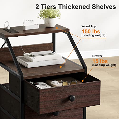 REAHOME - طاولة جانبية عصرية مع قاعدة شحن من رياهوم، طاولة جانبية بـ 3 أدراج قماشية ورفوف تخزين بمستويين، طاولة جانبية لغرفة النوم وغرفة المعيشة، لون بني محمر، مجموعة من قطعتين، خشب معدني