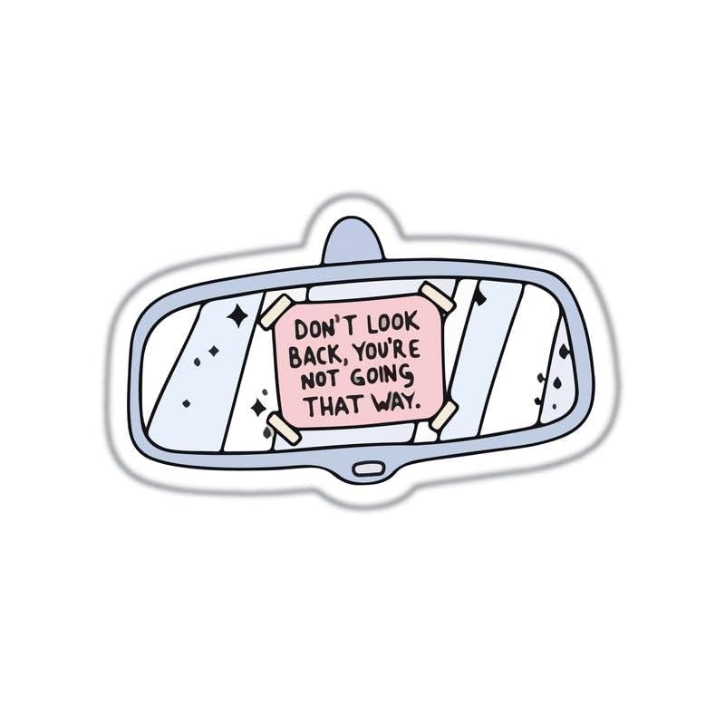 - التصميم: ملصق على شكل مرآة الرؤية الخلفية يتميز باقتباس ملهم "لا تنظر إلى الوراء، أنت لا تسير بهذه الطريقة" بأسلوب نظيف وعصري