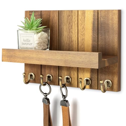 Rebee Vision - ريبي فيجن حامل مفاتيح من خشب اكاسيا يثبت على الحائط - حامل مفاتيح بنمط ريفي لتنظيم الحائط والبريد مع رف لديكور المنزل - مثالي لاساسيات الشقة (خشب اكاسيا، 3.54 انش × 10 انش × 7.3 انش)