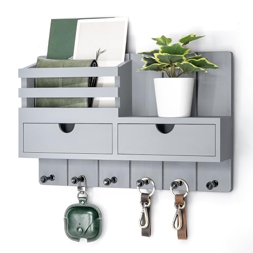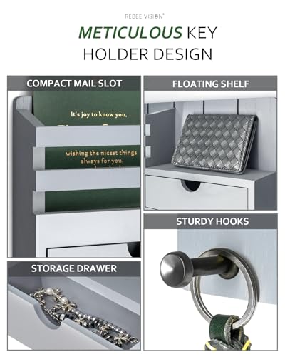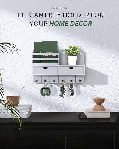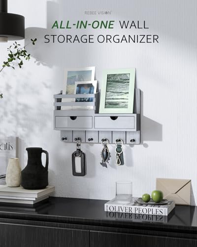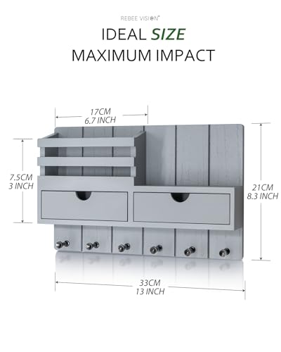 Rebee Vision - ريبي فيجن حامل مفاتيح مزخرف يثبت على الحائط للديكور الجمالي للغرفة - حامل بريد انيق للحائط مع 2 درج منظم و6 خطافات مفاتيح - اساسيات الشقة الحديثة (رمادي)