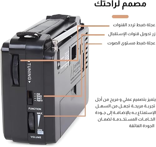 - يعمل هذا الراديو متعدد النطاقات على تيار متردد 220 فولت/50 هرتز ويوفر أربعة خيارات للاستماع بما في ذلك نطاقات ايه ام واف ام وSW1 وSW2، إلى جانب موجات صوت التلفزيون. صُممت هذه السماعة بحساسية عالية لاستقبال فائق الوضوح، وتأتي بتصميم كلاسيكي أنيق يمزج بين الوظائف الحديثة والمظهر الخالد.
