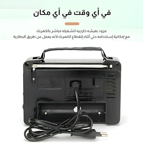 - بفضل مرونته الفائقة في توفير الطاقة، يمكن توصيل الراديو مباشرة بمقبس جداري من خلال مدخل التيار المتردد لضمان التشغيل المتواصل. بدلًا من ذلك، يمكن تشغيله ببطاريات جافة، مما يجعله مثاليًا للاستخدام في الهواء الطلق أو في الحالات التي لا تتوفر فيها الكهرباء، مما يضمن عدم تفويت برامجك أبدًا.