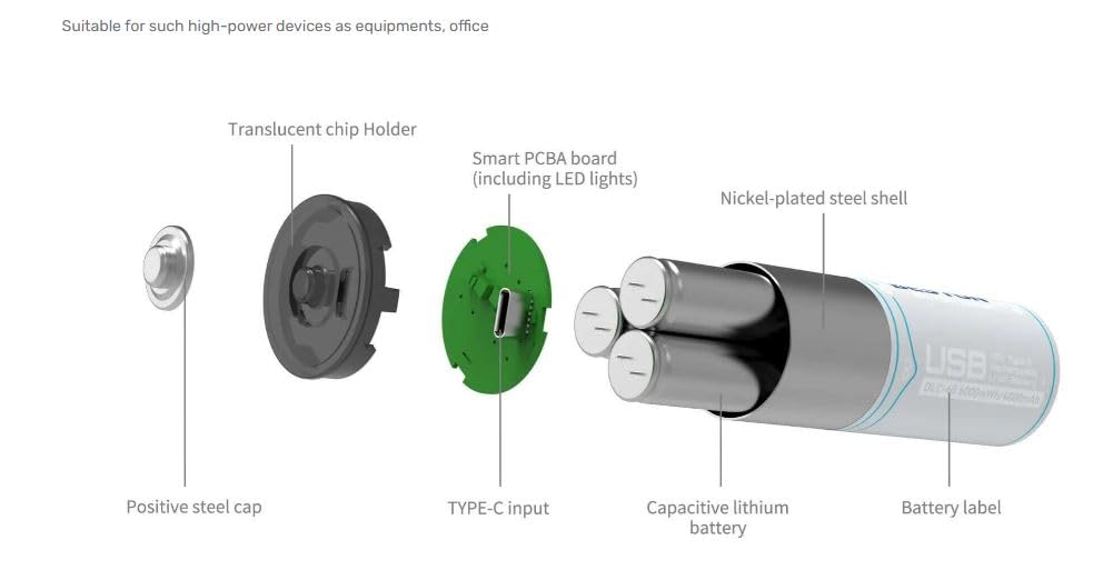 - الموديل: DCL-40، نوع البطارية: مقاس D. السعة: 4000 ميلي امبير في الساعة (6000 ميلي وات ساعة). نوع العنصر: ليثيوم أيون. الجهد الكهربائي للتشغيل: 1.5 فولت. تيار الشحن: 700 مللي أمبير. الجهد الكهربائي للشحن: 5 فولت. مدة الشحن: حوالي 3 ساعات. عمر الخدمة: > 1000 عملية شحن. المقاس: 32.2 × 61.2