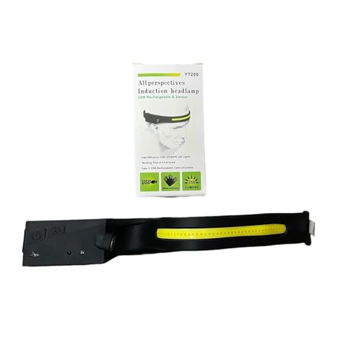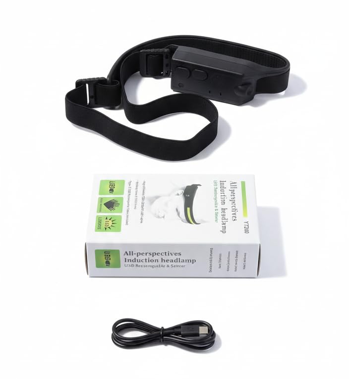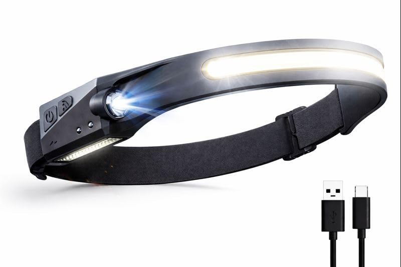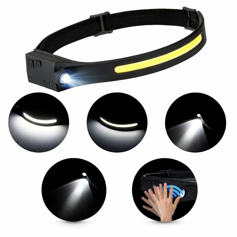 Generic - مصباح راس بمستشعر حركة قابل لاعادة الشحن، USB-C، 350 لومن، شعاع عريض 230 درجة، 5 اوضاع اضاءة، تحكم بالحث الموجي، حزام سيليكون مريح للجري والتخييم وصيد الاسماك وركوب الدراجات والطوارئ