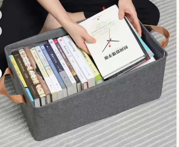 Generic - سله تخزين منزلية مستطيلة، قماش رمادي مع مقابض جلدية، 47 × 28 × 20 سم، منظم متعدد الأغراض