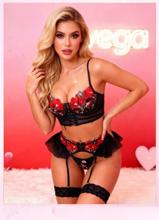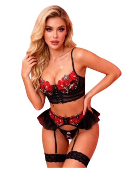 Generic - طقم لانجري تنكري شبكي مطرز بالورود الحمراء - 3 قطع (بوستيه، كيلوت، وحزام رباط) - مقاس موحد (50-70 كجم)
