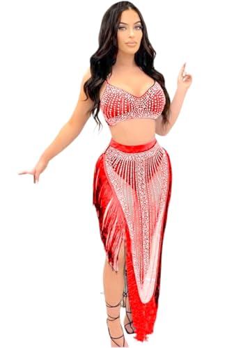 Generic - طقم لانجيري نوم بيبي دول رقص شرقي مزين بالكريستال، قطعتين، أحمر فري سايز