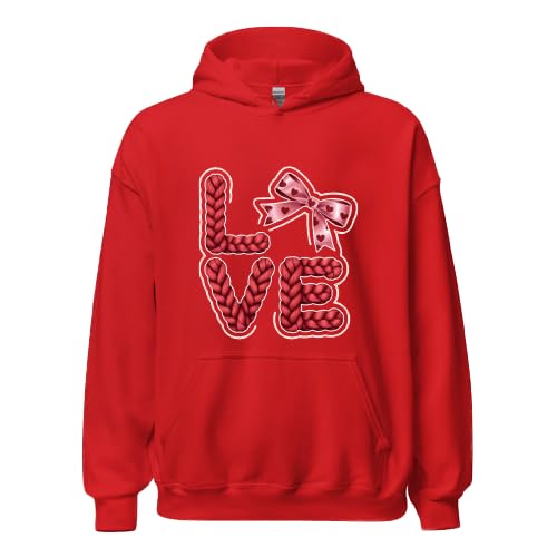Generic - هودي احمر مع رسومات الحب، تصميم نص مضفر، تفاصيل فيونكة وردية، مقاس عيد الحب (M)
