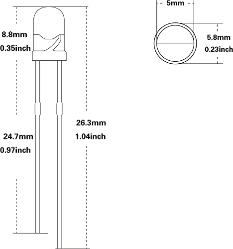 - 🔴قطر الأنبوب: 5 ملم دائري، 2 سلك من الرصاص. القطبية: الأنود (الجزء الأطول)/الكاثود (الجزء الأقصر).