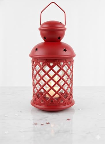 - تصميم زخرفي أنيق: فانوس معدني باللون الأحمر بنمط شبكي جميل مع نجوم مثقوبة على القبة العلوية لإضفاء لمسة جمالية مميزة