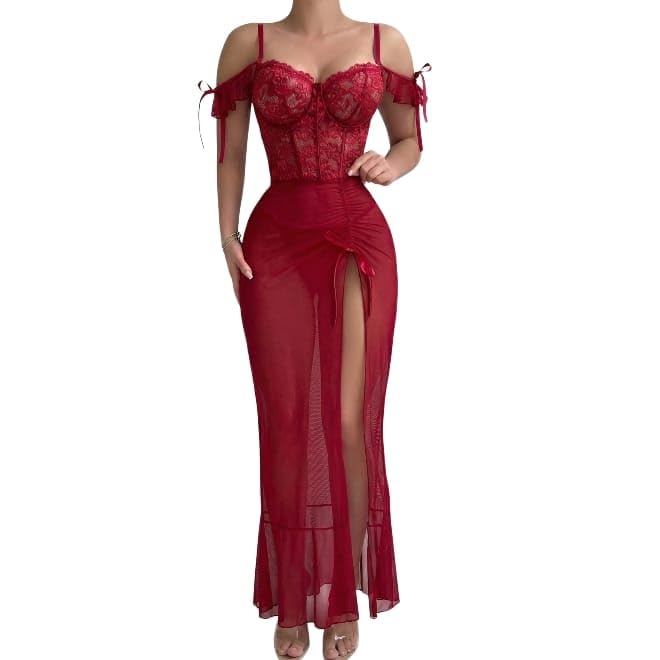 Generic - فستان أحمر بأكتاف مكشوفة، دانتيل، فتحة جانبية، مناسب للحفلات والمناسبات الخاصة