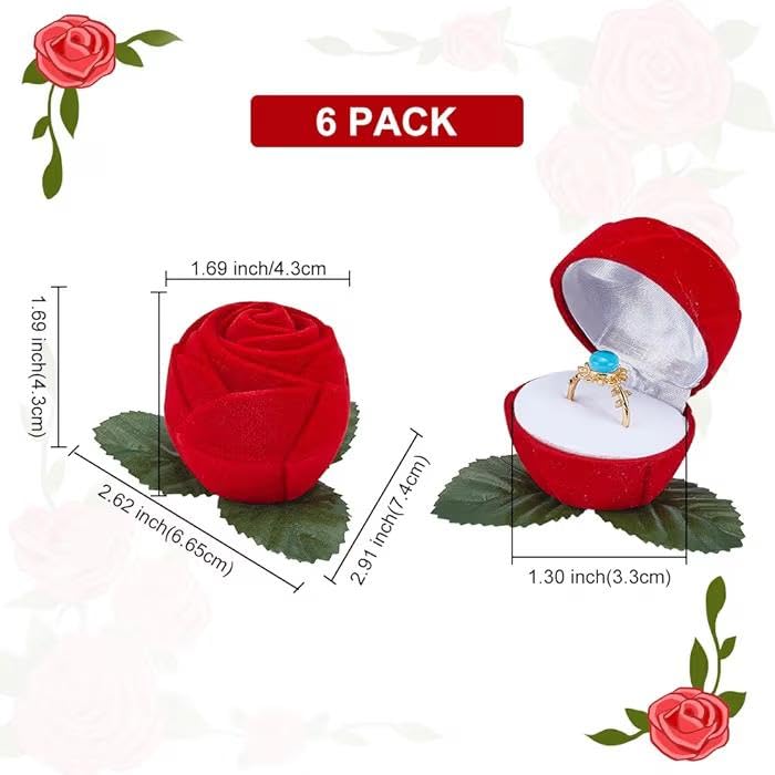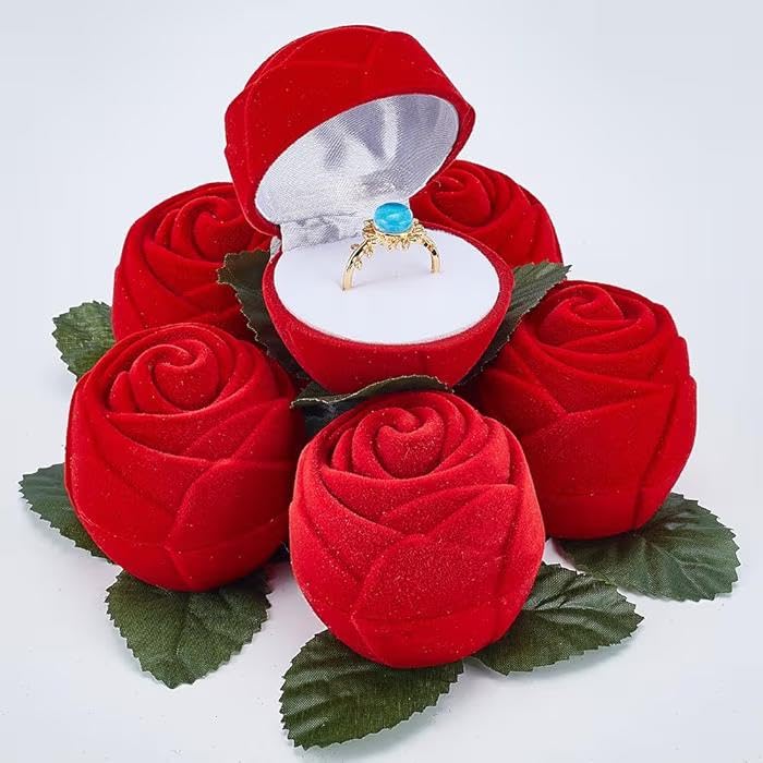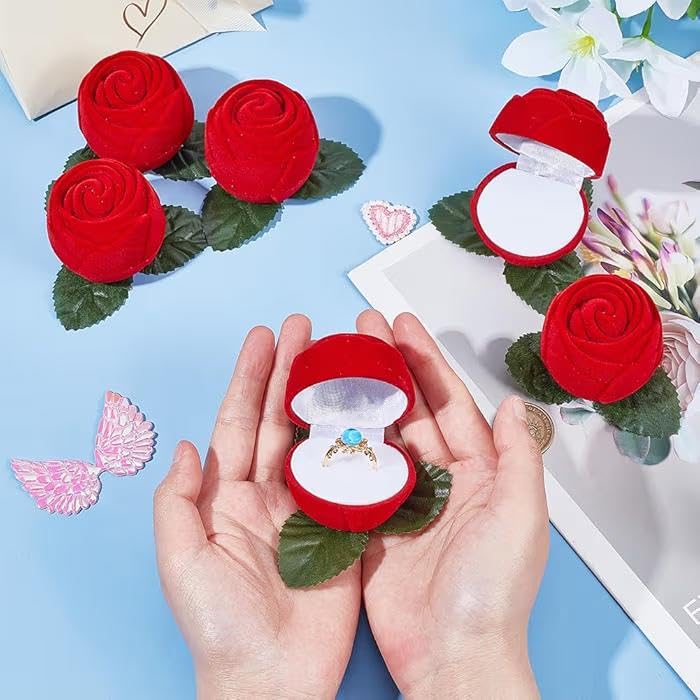 - تصميم فريد على شكل زهرة: صندوق خاتم مخملي أحمر بتصميم وردة رومانسية مع ورقة خضراء، مثالي لتقديم خاتم الخطوبة والزفاف بطريقة فريدة لا تنسى