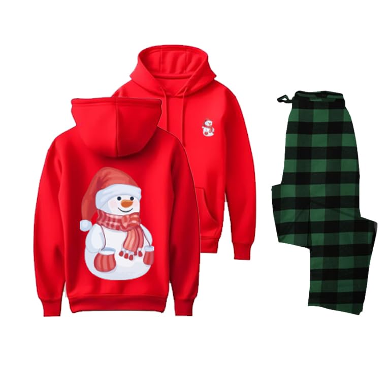 Generic - سويت شيرت بغطاء للراس بتصميم رجل الثلج الاحمر مع بنطلون منقوش باللون الاخضر، طقم مطابق لعطلة الكريسماس مقاس (L)