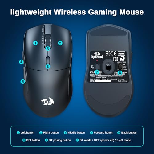 Redragon - ماوس ألعاب لاسلكي M815، ماوس لاسلكي خفيف الوزن بـ 3 أوضاع وأزرار قابلة للبرمجة بالكامل، برنامج 12000 نقطة لكل بوصة لدعم روابط المفاتيح التي تصنعها بنفسك من ريدراجون