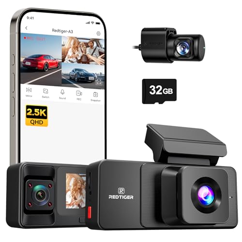 REDTIGER - كاميرا سيارة ثلاثية ايه 3 2.5K واي فاي 2.5K+1080P+1080P أمامي/خلفي/داخلي، شاشة 3.18 بوصة، 32GB متضمنة، رؤية ليلية بالأشعة تحت الحمراء، تسجيل متواصل، وقوف 24 ساعة، تدعم 256GB من ريد تايجر