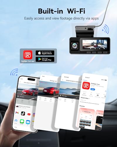 - [واي فاي وتحكم عبر التطبيق بدون مجهود] يمكنك توصيله بسهولة عبر WiFi بتطبيق ريد تايجر لمعاينات الفيديو الفورية والتنزيلات والإعدادات. تحكم في كاميرا سيارتك وعرض الصور في الوقت الفعلي ومشاركة المقاطع المهمة مباشرة من موبايلك الذكي - لا حاجة إلى أسلاك أو إعدادات معقدة.