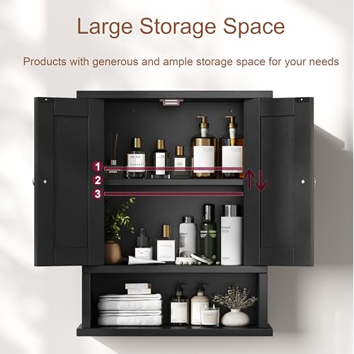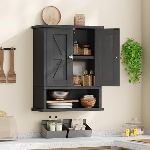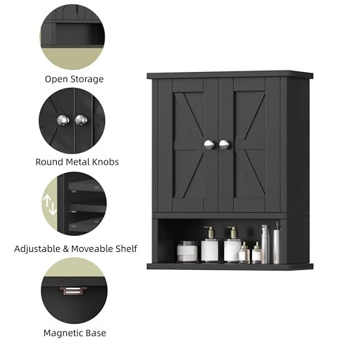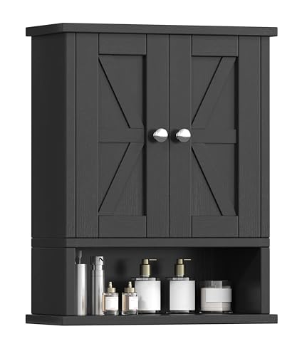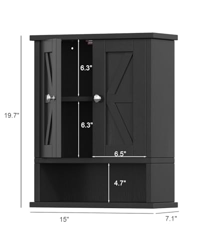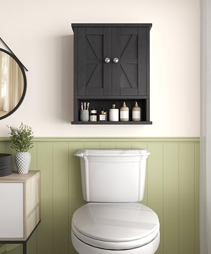 Reettic - ريتيتيك خزانة ادوية بتصميم ريفي مع بابين للحظيرة، خزانة حمام تثبت على الحائط مع رف قابل للتعديل، تخزين فوق المرحاض للحمام وغرفة المعيشة والمطبخ، اسود، BMGZ118B