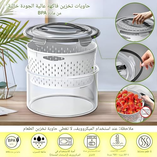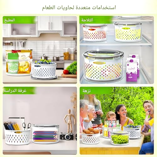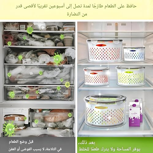 - هذه الحاويات الكبيرة لتخزين الفواكه والخضروات تأتي مع أغطية محكمة الإغلاق ومصفاة تصريف قابلة للإزالة، وتوفر سعات تتراوح بين 550 مل و5200 مل (19 أونصة إلى 183 أونصة)، مما يسمح بتخزين مجموعة متنوعة من المنتجات بشكل فعال ويطيل مدة نگها طازجة لأكثر من أسبوع، مما يسهل تنظيم الثلاجة وتقليل الحاجة للتسوق المتكرر.