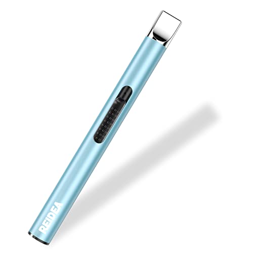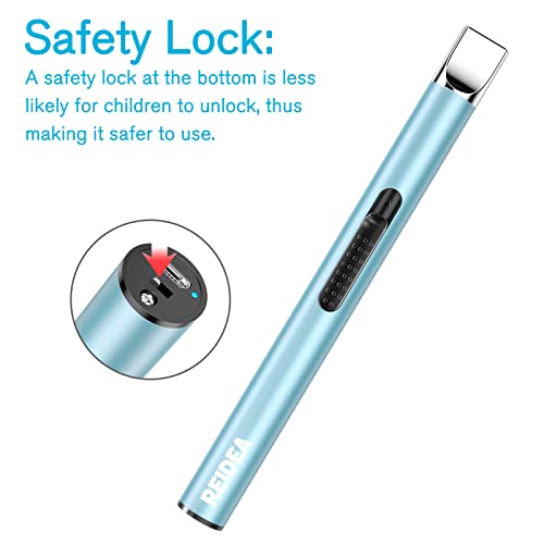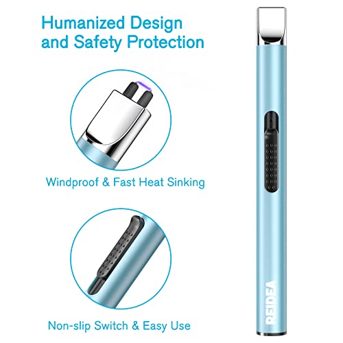 REIDEA - ولاعة مقوسة كهربائية USB ضد الرياح عديمة اللهب قابلة لاعادة الشحن مع هيكل طويل من الالومنيوم ومفتاح مانع للانزلاق، مثالية للشموع والشواء والتخييم والطهي (لون ازرق سماوي) من ريديا