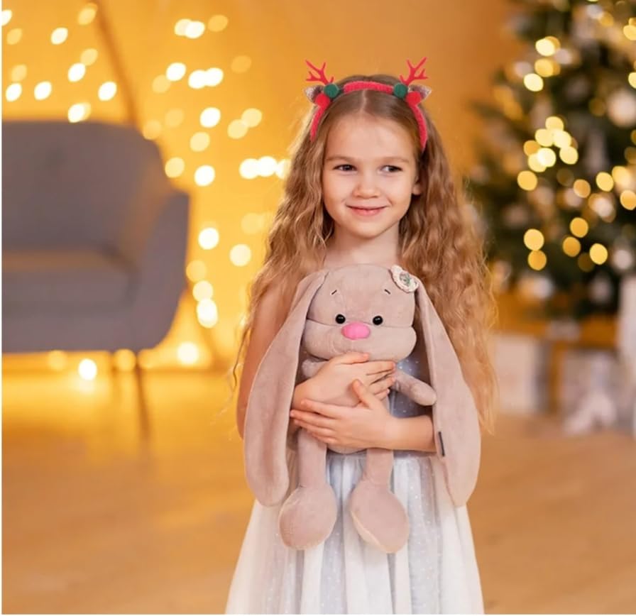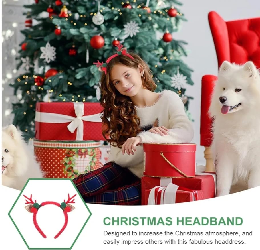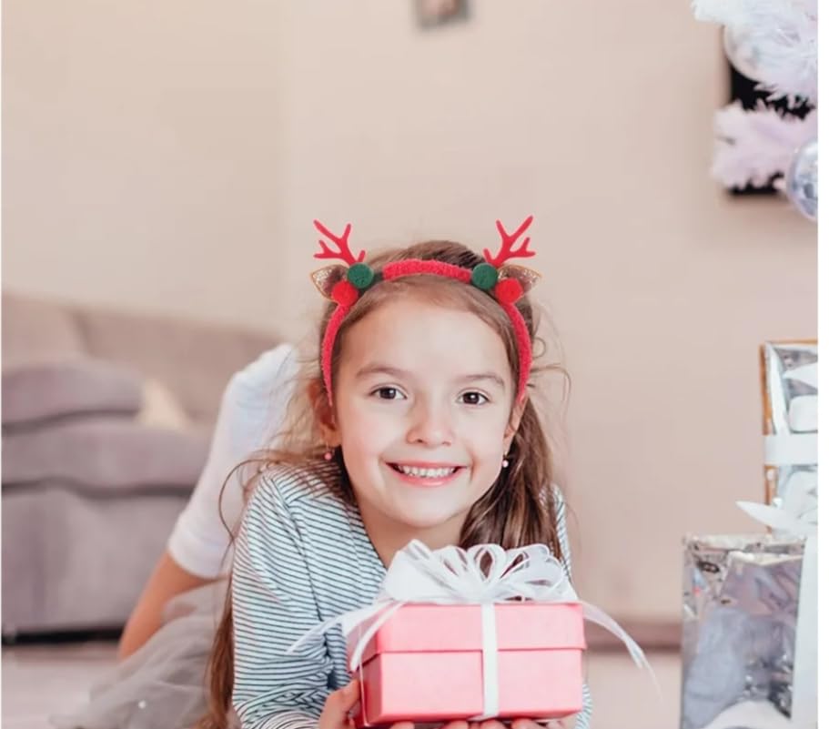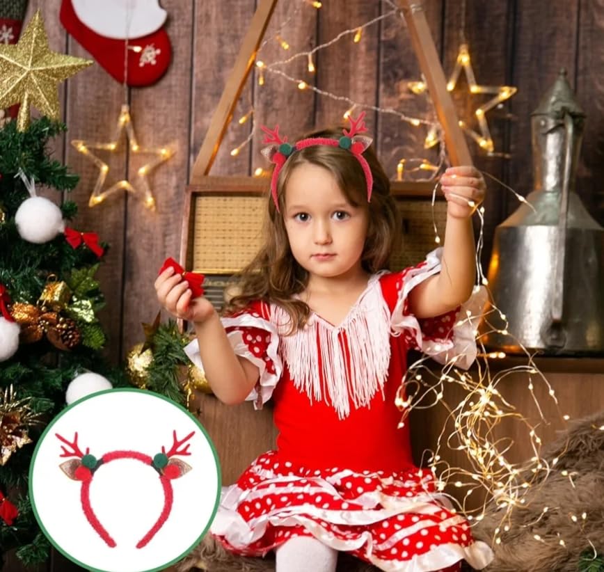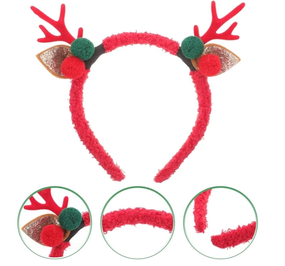 Generic - عصابة رأس بقرون الرنة، حمراء مع بومبومات خضراء وحمراء، آذان لامعة، ثيم الكريسماس
