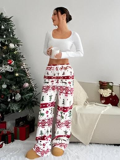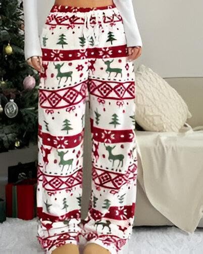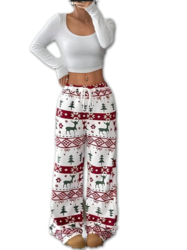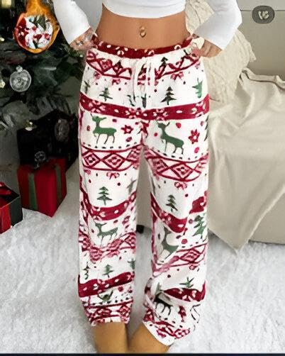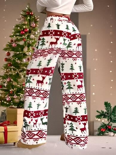 Generic - بنطلون مريح للعطلات - بنطلون مريح ناعم واحتفالي للنساء مع رباط إغلاق وقصة واسعة الساق، مزين بزخارف تقليدية للعطلات باللون الأحمر والأخضر والأبيض