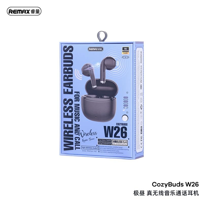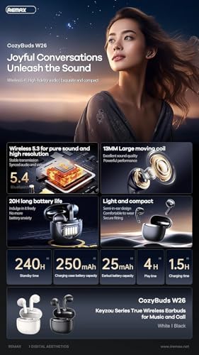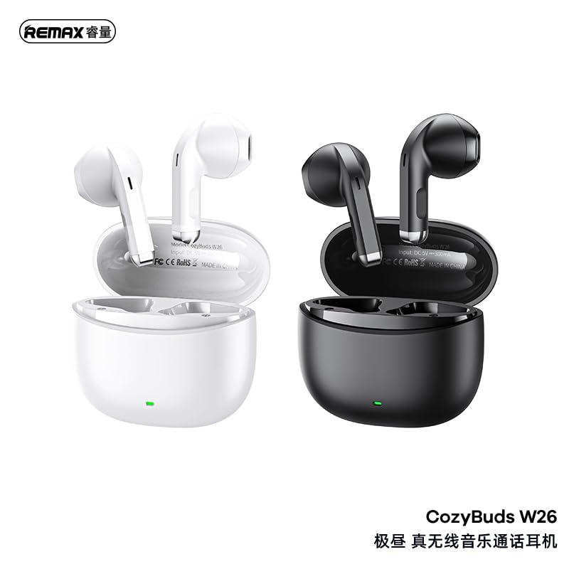Remax - سماعات كوزي بادز W26 اللاسلكية من ريماكس، مصنوعة من بلاستيك ايه بي اس، مع بلوتوث 5.4 ومشغل صوت 13 ملم ومدة تشغيل البطارية 20 ساعة، تصميم شبه داخل الأذن للموسيقى والمكالمات، لون أسود وأبيض، أبيض
