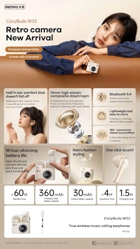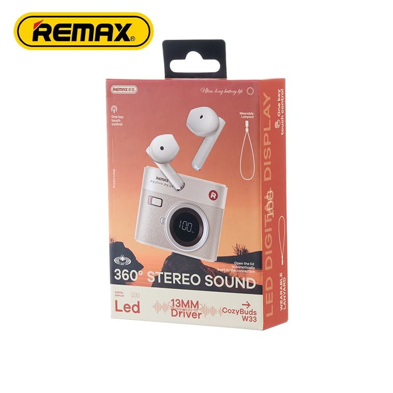 Remax - سماعات أذن لاسلكية W33 كوزي بادز بتصميم كاميرا رترو وبلوتوث 5.4 وصوت ستيريو 360° وعمر بطارية 18 ساعة وشاشة رقمية من ريماكس، أبيض (بيج)