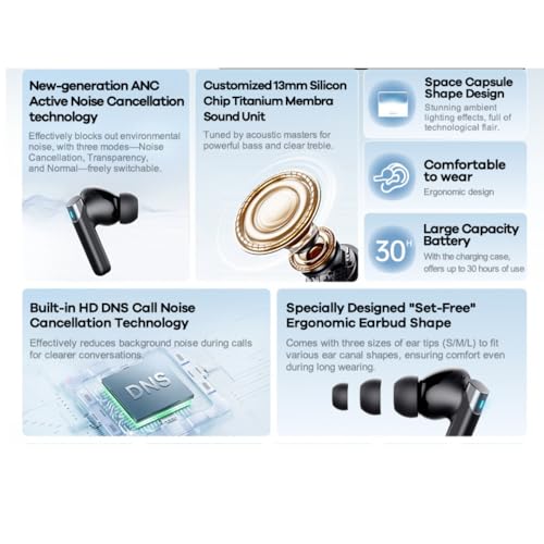 - خاصية إلغاء الضوضاء المتقدمة: تقنية إلغاء الضوضاء النشطة من الجيل الجديد مع ثلاثة أوضاع قابلة للتبديل (إلغاء الضوضاء والشفافية والعادية) لتجربة استماع مخصصة.