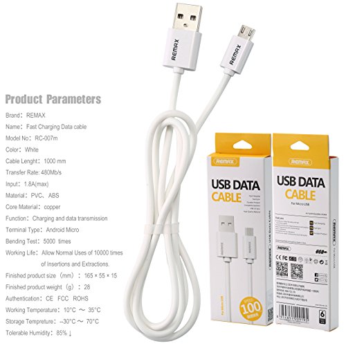 Remax - كابل شحن سريع ونقل بيانات مايكرو من ريماكس RC-007m، 1 متر - ابيض، لهواتف خلوية