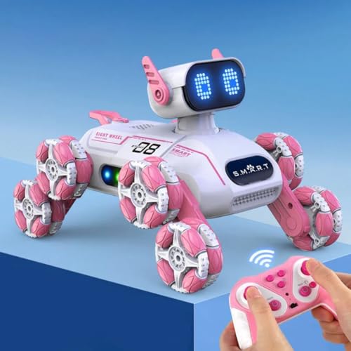 لعبة روبوت للكلاب بجهاز تحكم عن بعد، شاشة ليد، دفع 8 عجلات، لون وردي وأبيض، روبوت ذكي تفاعلي بهلواني بجهاز تحكم عن بعد