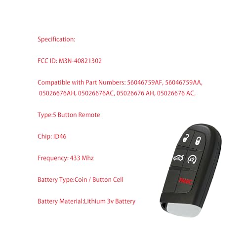- ✅【متوافق مع فوبيك】: معرف لجنة الاتصالات الفيدرالية (FCC ID): M3N-40821302. التردد: 433 ميجاهرتز. بديل مفتاح جهاز التحكم للسيارة هذا متوافق مع أرقام القطع التالية: 56046759AF، 56046759AA، 05026676AH، 05026676AC، 05026676 AH، 05026676 AC.