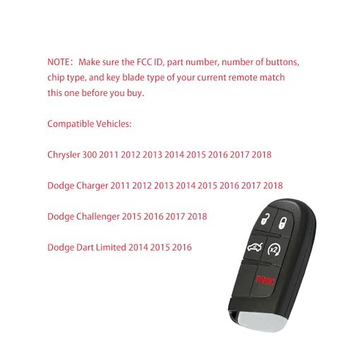 - ✅【مناسب للمركبات】: بديل مفتاح جهاز التحكم عن بعد هذا متوافق مع كرايسلر 300 (2011-2018)، دودج تشارجر (2011-2018)، دودج تشالنجر (2015-2018)، دودج دارت ليميتد (2014-2016). راجع وصف المنتج للحصول على القائمة الكاملة للمنتجات المتوافقة.