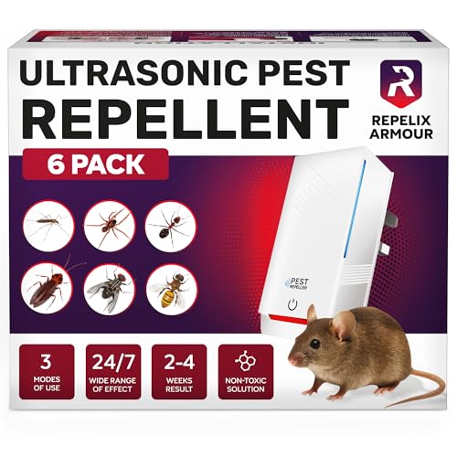 REPELIX ARMOUR - طارد الحشرات بالموجات فوق الصوتية من ريبليكس ارمور، عبوة من 6 قطع - يغطي 140 متر مربع لكل جهاز - 3 اوضاع - يطرد الفئران والجرذان والعناكب والبعوض والنمل والحشرات والذباب