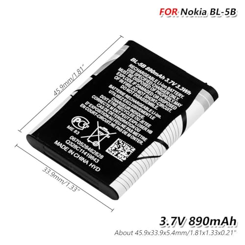 - متوافق مع نوكيا 3220، 3230، 5070، 5140، 5140i، 5200، 5208، 5300، 5320، 5500، 6020، 6021، 6060، 6070، 6080، 6120C، 6121C، 6122C، 7 260، 7360، N80، N90 | جودة عالية (الموديل: BL-5B HQ)