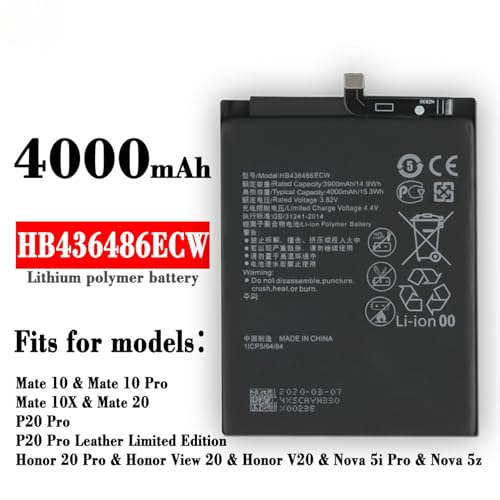 Generic - بطارية ليثيوم ايون بديلة HB436486ECW، 4000mAh، متوافقة مع هواوي ميت 20، ميت 10، ميت 10 برو، بي 20 برو، هونر 20 برو، هونر فيو 20، هونر في 20، نوفا 5 اي، نوفا 5z