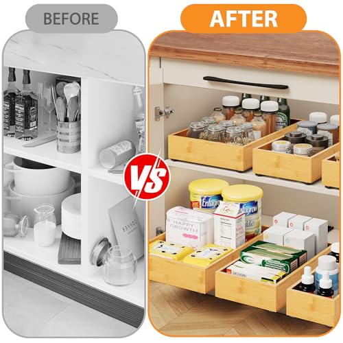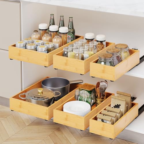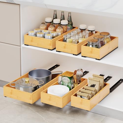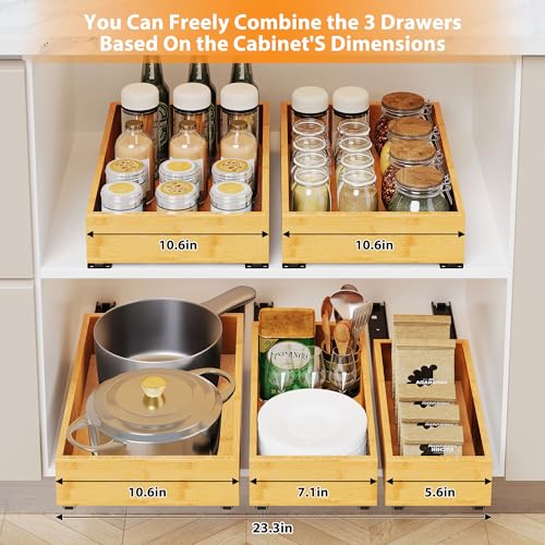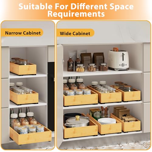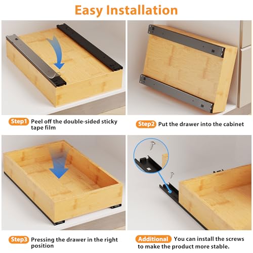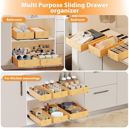RESENSTORE - منظم خزانة قابل للسحب من الخيزران من ريسينستور، ادراج منزلقة لخزائن المطبخ، مثبتة بطبقة لاصقة نانو متعددة الوظائف، منظمات ادراج متعددة الوظائف لخزانة المؤن والحمام وغرفة النوم - 3 قطع
