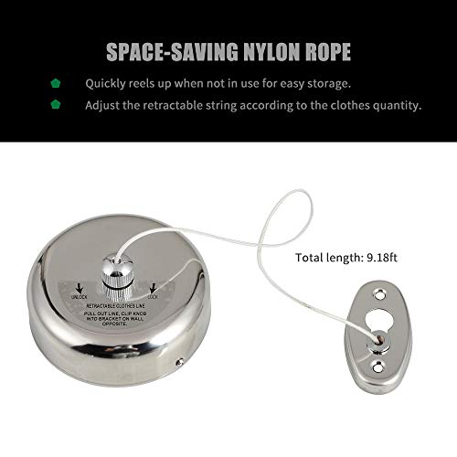 - طول قابل للتعديل: يتميز بحبل نايلون بطول 9 أقدام، يمكن أن يمتد حبل الغسيل هذا حتى 2.8 متر (9.2 قدم)، مما يسمح لك بضبط الخيط القابل للسحب بناءً على كمية الغسيل للحصول على أقصى قدر من الراحة