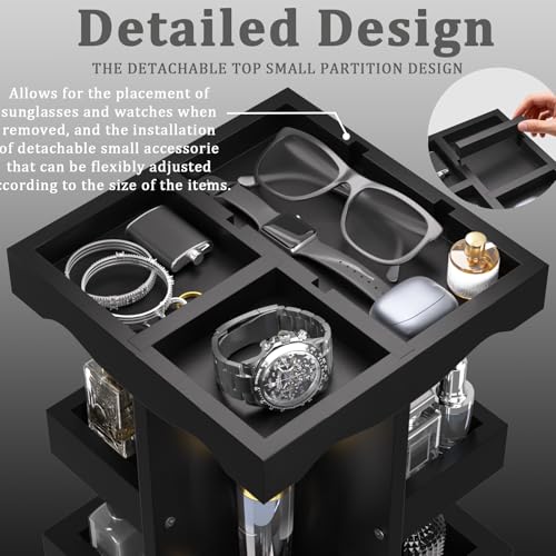 - استخدام مريح: التصميم الدوار ومساحة التخزين المفتوحة تجعل من السهل عليك الوصول إليها. يسمح لك القسم العلوي القابل للفصل بضبط المساحة بمرونة لتلبية احتياجات الوضع المختلفة. يمكن لحامل الكولونيا للرجال تخزين العطور والساعات والمجوهرات ومفاتيح السيارة وغيرها من الملحقات.