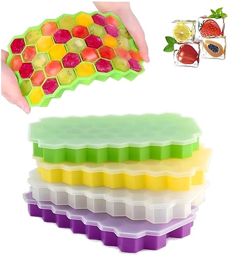 Generic - صينية مكعبات ثلج قابلة لإعادة الاستخدام بتصميم خلية عسل مصنوعة من السيليكون مع غطاء للحفاظ على النكهة وتجميد العصائر والمشروبات بشكل مثالي (4 قالب)