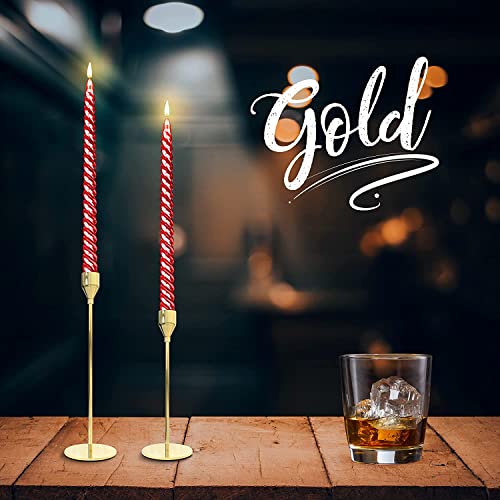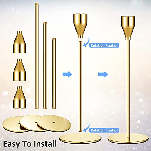 REVHQ - حوامل شموع ذهبية من ريفهك، مجموعة من 3 قطع تناسب شمعدان ذهبي أصفر طويل 1.9 سم وشموع معدنية حديثة LED، حوامل أنيقة لتزيين الطاولات المركزية لحفلات العشاء والكنيسة، تركيبات الديكور