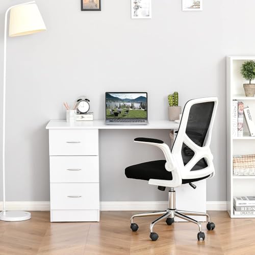 - مكتب بلون أبيض مقاس 120 سم مع 3 أرفف وأدراج، ينظم ركن الكمبيوتر بلمسة فنية أنيقة.