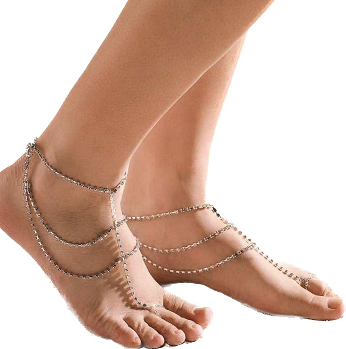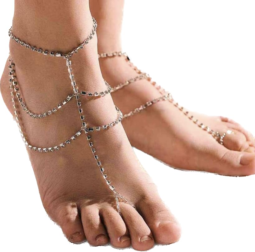 Generic - خلخال صندل بيرفوت مرصع باحجار الراين للشاطئ، سوار للكاحل، مجوهرات سلسلة قدم للزفاف (قطعة واحدة) للنساء والفتيات (فضي)