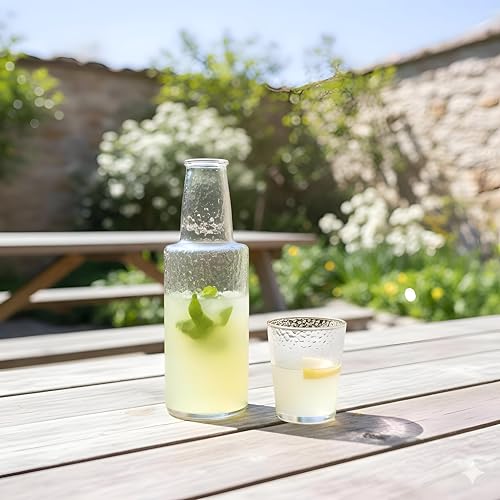 - تضمن سعة 1 لتر مساحة تخزين واسعة للعصائر أو الماء أو الشاي، بينما يحافظ الزجاج الكريستالي على نقاء ومذاق كل مشروب.