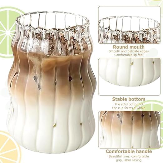 - شكل مموج مبتكر: كوب شرب مصمم بشكل مموج فريد وجميل من الزجاج بتصميم بسيط وأنيق ومريح للحمل في اليد، ما يضفي مظهرًا جديدًا على طاولتك. مواد موثوقة: كوب للقهوة المثلجة مصنوع من زجاج شفاف متين عالي الجودة وخالي من الرصاص والبيسفينول أ. يمكن استخدام كوب العصير بأمان لفترة طويلة. قابل للغسيل في غسالة الأطباق.