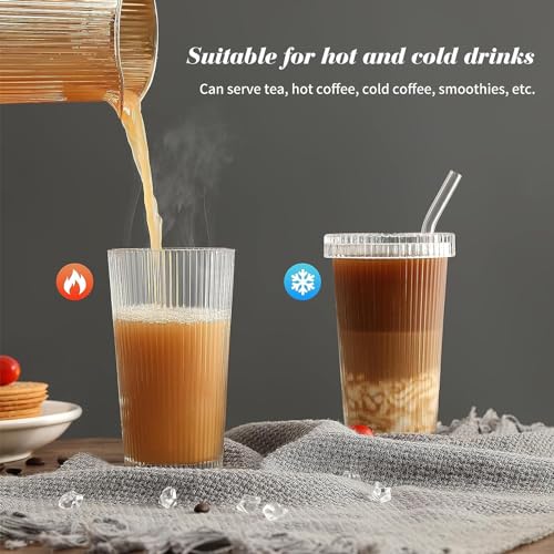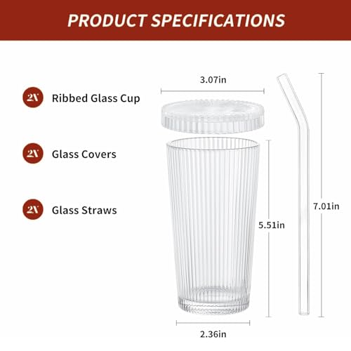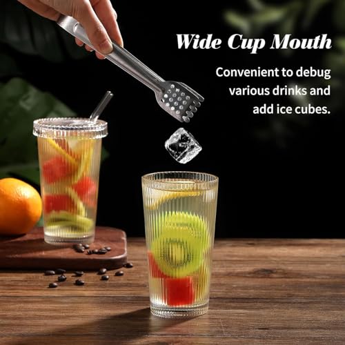 Aping - أكواب زجاجية مضلعة مع أغطية وشفاطة، قطعتين من أكواب الشرب، كوب قهوة مثلجة مضلع، كوب زجاجي سعة 375 مل مع شفاطة وغطاء، كوب قهوة مثلجة للمشروبات والمشروبات الغازية