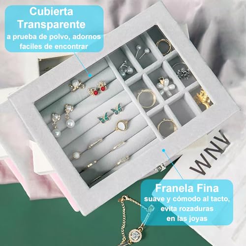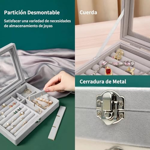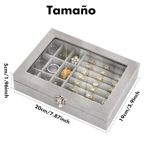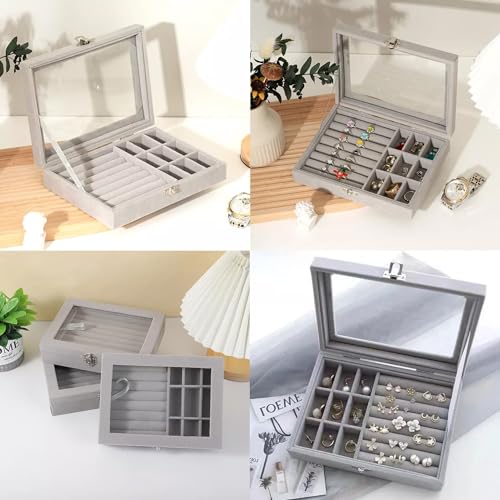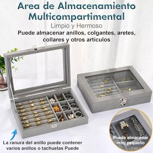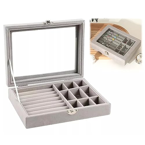 RichLuck - علبة بنافذة عرض لتنظيم المجوهرات والخواتم، صندوق محمول مصنوع من قماش قطيفة لحفظ السلسلة والحلقان، صندوق تخزين شفاف للحلي، رمادي، من رتش لاك