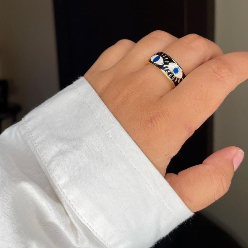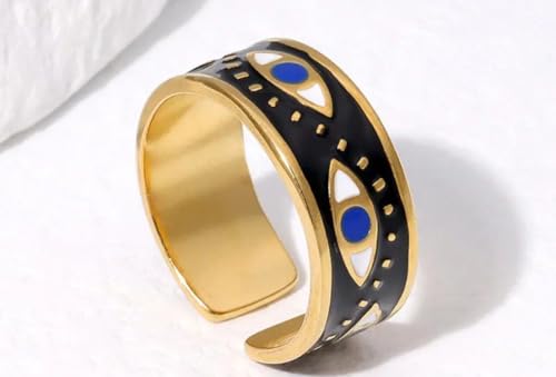 Generic - خاتم عين الحسد من الستانلس ستيل مطلي بالذهب عيار 18 قيراط للنساء - اسود قابل للتعديل