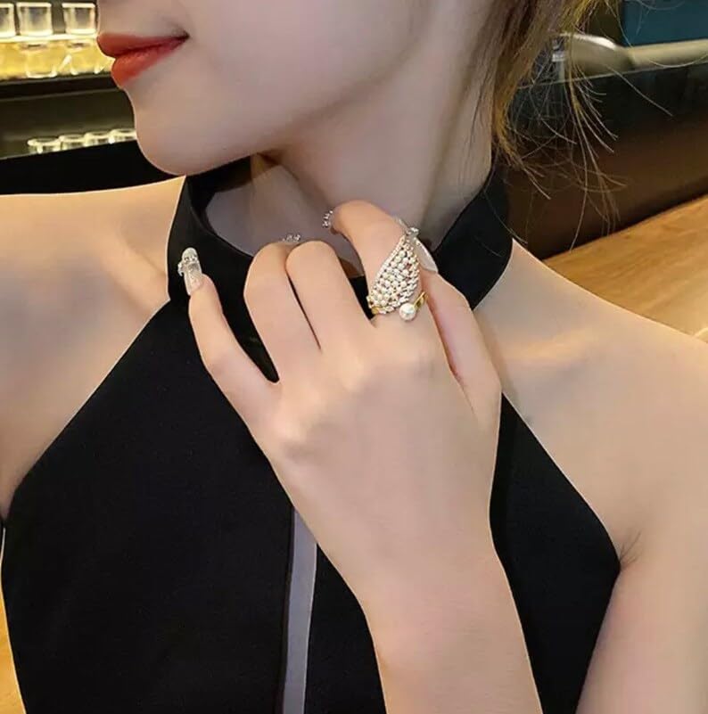 Generic - خاتم فالكون جناح مرصع بالزركونيا واللؤلؤ الصناعي من الستانلس ستيل مطلي بالذهب عيار 18 قيراط للنساء هدية رائعة للصداقة - قابل للتعديل