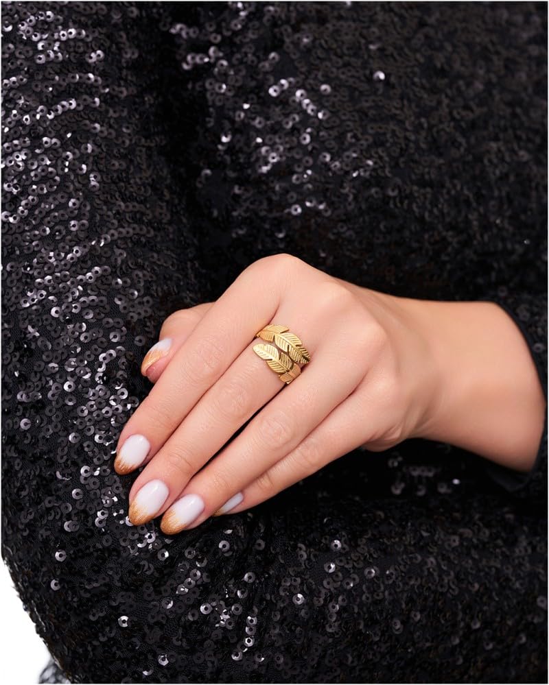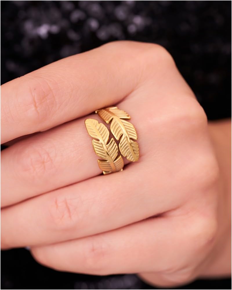 Generic - خاتم ريشة مزدوج يرمز إلى الحرية والنعمة من الستانلس ستيل مطلي بالذهب عيار 18 قيراط - قابل للتعديل